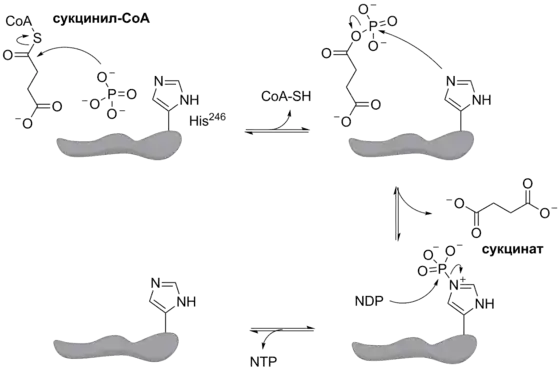 Эта энергозапасающая реакция включает промежуточные этапы, на которых молекула фермента сама становится фосфорилированной по остатку гистидина в активном центре. Эта фосфорильная группа, которая имеет высокий потенциал для переноса, переносится на АДФ или ГДФ с образованием АТФ или ГТФ соответственно. В клетках животных имеется два изозима сукцинил-КоА-синтетазы, один из которых специфичен к АДФ, а другой — к ГДФ. Сукцинил-КоА-синтетаза состоит из двух субъединиц: α-субъединица (Mr = 32 000) содержит фосфорилируемый остаток гистидина (His246) и место связывания КоА, а β-субъединица (Mr = 42 000) обеспечивает специфичность связывания с AДФ или ГДФ. Активный центр находится в промежутке между субъединицами. Кристаллическая структура сукцинил-КоА-синтетазы содержит две «силовые спирали» (англ. power helices), по одной в каждой субъединице, причём эти спирали ориентированы таким образом, что их электрические дипольные моменты смещают частично положительные заряды к отрицательно заряженному гистидинфосфату (P—His); благодаря этому стабилизируется промежуточная фосфорилированная форма фермента[15]. Ниже представлена схема реакции, катализируемой сукцинил-КоА-синтетазой: