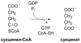 Сукцинил-КоА, как и ацетил-КоА, содержит тиоэфирную связь с большой отрицательной стандартной свободной энергией гидролиза (ΔG′о ≈ −36 кДж/моль). В следующей стадии цикла трикарбоновых кислот энергия, выделяемая при расщеплении тиоэфирной связи, используется на образование фосфоангидридной связи в ГТФ или АТФ, при этом сукцинил-КоА превращается в сукцинат[14] (реакция 6 на общей схеме):