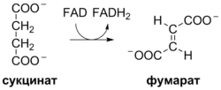 Сукцинат, образовавшийся из сукцинил-КоА, окисляется в фумарат под действием флавопротеина сукцинатдегидрогеназы[17] (реакция 8 на общей схеме):