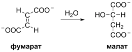 Обратимая гидратация фумарата с образованием L-малата катализируется ферментом фумаразой (точнее, фумаратгидратазой). Переходным продуктом этой реакции является карбанион[17] (реакция 9 на общей схеме):
