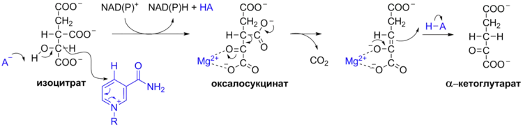 - Изоцитрат окисляется при переносе водорода от изоцитрата на НАД+ или НАДФ+, в зависимости от изозима изоцитратдегидрогеназы (об изозимах см. ниже). В результате окисления образуется оксалосукцинат.