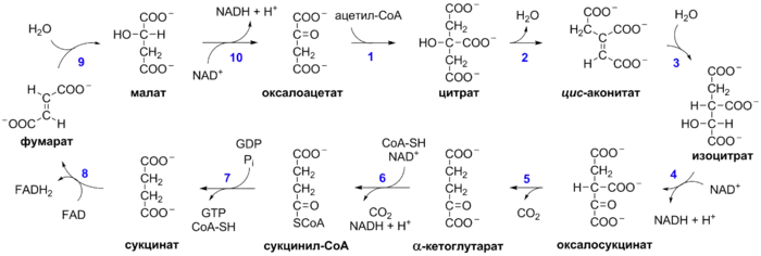 (щавелевоуксусная кислота, лимонная кислота, цис-аконитовая кислота, изолимонная кислота, α-кетоглутаровая кислота, сукцинил-KoA, янтарная кислота, фумаровая кислота, яблочная кислота, щавелевоуксусная кислота).