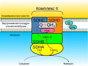 У эукариот сукцинатдегидрогеназа прочно связана со внутренней митохондриальной мембраной, у бактерий она располагается на плазматической мембране. Этот фермент содержит 3 различных железосерных кластера и одну молекулу ковалентно связанного с ним ФАД, являющегося простетической группой фермента. Электроны от сукцината проходят через ФАД и железосерные кластеры, а далее они в составе переносчиков электронов попадают на дыхательную электронтранспортную цепь, расположенную на внутренней мембране митохондрий (плазматической мембране у бактерий). ФАД при этом восстанавливается до ФАДH2, однако дальнейшим акцептором электронов является убихинон[2]. Переход электронов от сукцината через эти переносчики на конечный акцептор электронов — кислород — сопряжён с синтезом АТФ, причём на пару электронов образуется 1,5 молекулы АТФ. Малонат, обычно отсутствующий в клетках, является сильным конкурентным ингибитором сукцинатдегидрогеназы, и добавление этого соединения в митохондрии блокирует активность цикла трикарбоновых кислот[17].
