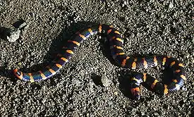 Окраска тёмных цветов со светлыми кольцами на туловище и хвосте.