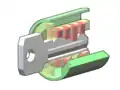 1) сердечника с узким фасонным сквозным пазом для плоского ключа и четырёх-пяти борозд, которые расположены в одну линию перпендикулярно к положению оси сердечника в центре узкой стороны бороздки;