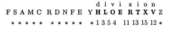 Для каждой позиции вероятного слова можно определить, будут ли все соответствующие символы находиться среди имеющихся. То есть для слова «division» 8 подряд идущих букв шифртекста должны встретиться (при фиксированном сдвиге) на нужных позициях (то есть в верной последовательности). Так последовательно проверяются все возможные сдвиги до первого совпадения. В атаке, проведенной де Виари, такое совпадение было найдено на сдвиге равном четырём и с сочетанием HLOERTXV. То есть, порядок дисков уже частично определён (исходя из предыдущего рисунка).