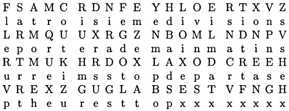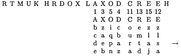 Таким образом, зная этот порядок, можно расшифровать слова или их фрагменты в других строках шифртекста на тех же позициях. Например, в третьей строке расшифровывается слово «departas».
