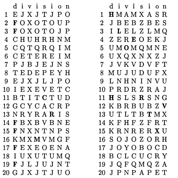 Пусть вероятным словом является «division». Множество встречающихся криптосимволов читаются вертикально под символами открытого текста. Так как расположение букв на дисках известно, то соответственно известно и на какую букву заменится буква открытого текста при сдвиге на определённое количество символов по диску. На рисунке приведены все возможные зашифрования каждого символа открытого текста, при сдвиге на 1 символ (слева), при сдвиге на 4 символа (справа).
