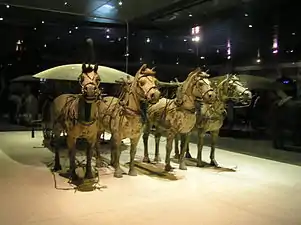 Для сопровождения императора в потустороннем мире было изваяно бесчисленное терракотовое войско. Лица воинов индивидуализированы, их тела прежде были ярко окрашены. В отличие от своих предшественников — например, правителей государства Шан (около 1300—1027 годов до н. э.) — император отказался от массовых человеческих жертвоприношений.