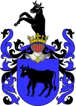 В голубом поле вол, или телёнок, чёрного цвета, идущий вправо. В нашлемнике выходящая голова чёрного телёнка, также обращенная вправо.