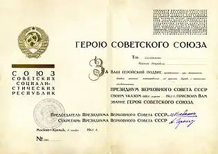 - Герой Советского Союза (6 марта 1945) медаль «Золотая Звезда» (№ 5083)[6];