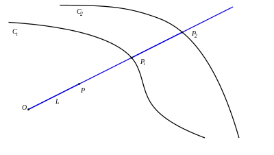 Пусть C1 и C2 — две непараллельные прямые и пусть O — начало координат. Пусть C1 и C2 задаются в полярных координатах уравнениями