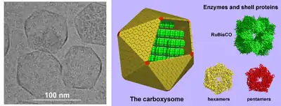 Другой класс белковых компартментов — бактериальные микрокомпартменты, которые состоят из белковой оболочки, заключающей в себе разнообразные ферменты[44]. Обычно такие компартменты имеют размер 100—200 нм и состоят из плотно подогнанных друг к другу белков[45]. Хорошо изученным примером микрокомпартмента может служить карбоксисома, которая содержит ферменты фиксации углерода (например, рубиско)[46].
