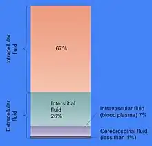 Большую часть объёма цитозоля составляет вода (около 70 % в типичной клетке)[11]. рН внутриклеточной жидкости составляет 7,4[12], при этом у человека рН цитозоля составляет от 7,0 до 7,4 и имеет большее значение в случае растущих клеток[13]. Вязкость цитоплазмы примерно такая же, как у воды, хотя скорость диффузии малых молекул через эту жидкость примерно в 4 раза меньше, чем в чистой воде, из-за столкновений с многочисленными макромолекулами[14]. На примере рачков-артемий было показано, как вода влияет на клеточные функции. Показано, что сокращение доли воды в клетке на 20 % останавливает метаболизм, причём при высыхании клетки скорость метаболизма прогрессирующе падает, и всякая метаболическая активность прекращается, когда уровень воды в клетке падает на 70 % ниже нормы[3].