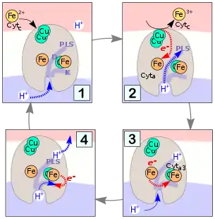 - Электрон быстро перемещается c CuA-центра на гем a, что ведёт к изменению окислительно-восстановительного потенциала и заставляет молекулы воды в канале D переориентироваться, делая его открытым для протона. В результате перемещения электрона с CuA на гем a происходит перемещение протона через канал D и его загрузка в сайт загрузки протона PLS (англ. proton loading site).