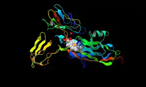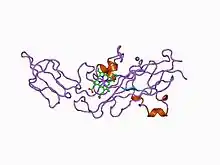 ![]() Цитохром f из Spinácia olerácea (снизу) восстанавливает пластоцианин (сверху). Синим в центре показаны две альфа-спирали, справа - бета-сэндвич. Светло-вишнёвым показан атом меди. Трансмембранный домен цитохрома f не показан. | |