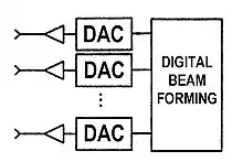 Цифровое диаграммообразование подразумевает под собой цифровой синтез диаграммы направленности в режиме приёма, а также формирование заданного распределения электромагнитного поля в раскрыве антенной решётки — в режиме передачи[33][34]. При большом количестве каналов представляет собой вычислительную сеть, объединяющую несколько цифровых модулей обработки сигналов[33][34]. Наибольшее распространение получило выполнение цифрового диаграммообразования (англ. digital beamforming) на основе операции быстрого преобразования Фурье[29][35][36][37], позволяющего формировать ортогональную систему так называемых вторичных пространственных каналов, в которой максимум диаграммы направленности одного канала совпадает с нулями остальных.