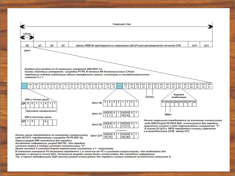 Каждый кадр E1 содержит 256 бит, разделённых на 32 временных интервала (тайм-слота, на рисунке — канальные интервалы, КИ) по 8 бит в каждом и содержащих передаваемые данные одного канала. Скорость передачи составляет 8 000 кадров в секунду и, следовательно, для каждого канала данных обеспечивается полоса 64 кбит/с. Число доступных пользователю тайм-слотов составляет от 0 до 31, в зависимости от сигнализации, чаще всего 30 (слот 0 зарезервирован для служебной информации, слот 16 рекомендован, но не обязателен для служебной информации). Соответственно для передачи данных и голоса могут использоваться слоты с 1 по 31.
