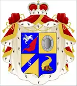 ![]() ОГ V, 7 Щит разделен на четыре части, из коих в первой части, в голубом поле, диагонально с правого нижнего угла изображено свернутое знамя красного цвета, и над оным виден ездок с копьем, скачущий на белом коне в правую сторону. Во второй части, в золотом поле, – щит. В третьей части, в золотом же поле, находится голубая полоса, означенная диагонально с левого верхнего угла, на которой посредине видна литера S. В четвертой части, в голубом поле, золотой рог изобилия. Щит покрыт мантиею и шапкою, принадлежащими Княжескому достоинству. | |