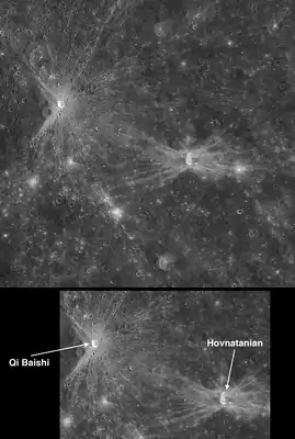 - Low-angle Impacts: A Look at Qi Baishi and Hovnatanian (англ.) (недоступная ссылка). MESSENGER photo gallery. Johns Hopkins University, Applied Physics Laboratory (10 марта 2009). Дата обращения: 27 января 2014. Архивировано 10 июля 2012 года.