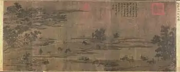 - «Пейзаж с буйволами и погонщиками» из Музея Гугун, Пекин. Свиток размером 47.3 х 115.6 см, тушь и краски по шёлку. На свитке есть надпись цзиньского правителя Чжан-цзуна (прав. 1190-1208) с атрибуцией картины Ци Сюю. Кэхилл считает, что это произведение является копией, созданной в ранний период правления династии Южная Сун (1127-1279).