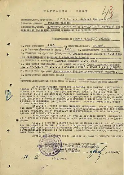 В очередной раз к ордену Красного Знамени гвардии капитана Цуканова представили осенью 1944 года. К моменту этого представления прошел ещё один год боевой жизни офицера, участия в наступательных боях по освобождению территории Советского Союза. Представляя своего помощника к награде, начальник штаба 25-й гвардейской гаубичной артиллерийской Львовской Краснознаменной бригады большой мощности РГК гвардии майор Кукин отразил следующие заслуги: