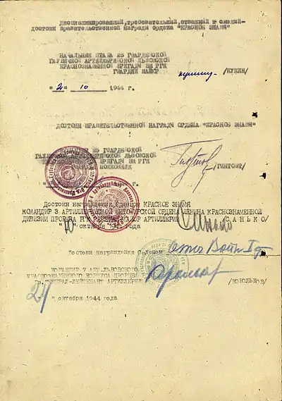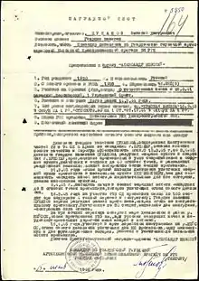 - Центральный Архив Министерства Обороны РФ. Наградные листы: опись 690306, дело 640, лист 49 и дело 1333, лист 164.