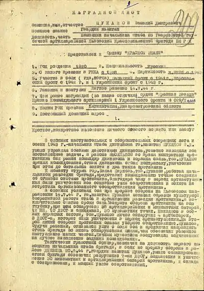 Длительное время не имея подтверждения тому, что поданное представление о награждении офицера было или же будет реализовано, и в связи с окончанием боевых действий, командир бригады вновь готовит представление к награде на гвардии капитана Цуканова, в котором почти дословно отражает текст предыдущей реляции, дополняя её заслугами, совершенными дивизионом под командованием гвардии капитана Цуканова в последние дни войны:
