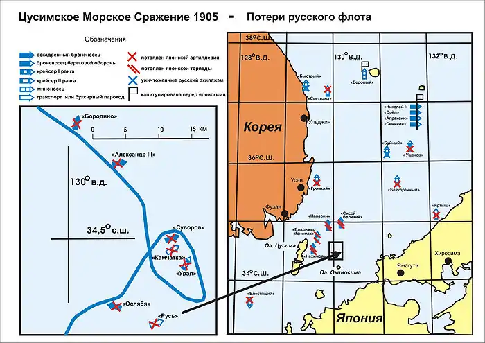 Цуси́мское морско́е сраже́ние (яп. 対馬海戦, цусима-кайсэн или, чаще, 日本海海戦, нихонкай-кайсэн — морская битва в Японском море) — морская битва 14 (27) мая — 15 (28) мая 1905 года в районе острова Цусима (Цусимский пролив), в которой российская 2-я эскадра флота Тихого океана под командованием вице-адмирала З. П. Рожественского потерпела сокрушительное поражение от Императорского флота Японии под командованием адмирала Хэйхатиро Того. Последнее, решающее морское сражение русско-японской войны 1904—1905 годов, в ходе которой русская эскадра была полностью разгромлена. Большая часть кораблей была потоплена противником или затоплена собственными экипажами, часть капитулировала, некоторые интернировались в нейтральных портах, и лишь четырём удалось дойти до русских портов.