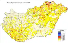 Цыгане традиционно проживали в сельской местности, но со второй половины XX века многие из них переехали в города. Так, в Будапеште число цыган составляет 12 273 человека (2001). По данным переписи 2001 года, в Венгрии проживает 205 720 цыган, но реальное их количество составляет от 450 000 до 1 000 000 человек[23][24].