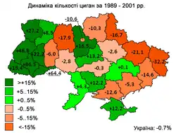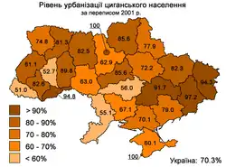Цыгане проживают во всех регионах Украины, но больше всего их в Закарпатье, и Южной Бессарабии. Почти половина их живёт в городах. В Закарпатье проживают следующие группы цыган: словацкие цыгане (потомки переселенцев начала XX века), кэлдэрары, венгерские цыгане (выходцы из Венгрии), проживающие компактными группами. Наибольшее количество цыган находится в Мукачево (1,4 %), в Виноградовском (0,8 %), Береговском (4,1 %) и Ужгородском (4,1 %) районах Закарпатской области[22]. Русские цыгане (выходцы с юга России в начале XX века), ловари и сервы живут в украинском Полесье. Основными местами компактного проживания являются Прилуки, Нежин, Чернигов и Остёр. Среди цыган Житомирщины больше всего представителей группы ловарей, которые имеют свои компактные поселения в Житомире (район Богуния), селе Тетеревка Житомирского района и в городе Малин. Сервы живут рассеянно небольшими группами среди представителей других этногрупп. Для них характерно проживание в крупных городах Житомирской и Черниговской областей (города Чернигов, Житомир, Коростень, Малин).