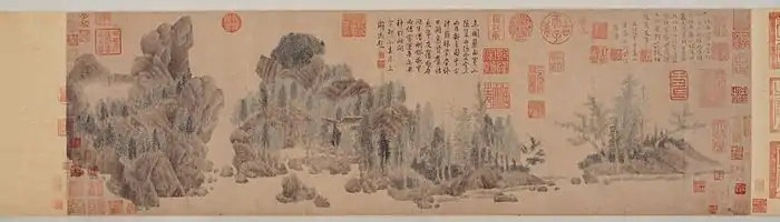 - 39 Ван Сичжи восторгается плывущими гусями, глядя из павильона. Свиток, тушь и краски по бумаге. Поэма художника. Печати периода Юань и более поздних веков. Музей Метрополитен Н-Й (Ещё одна версия хранится в Гугун, Тайбэй).