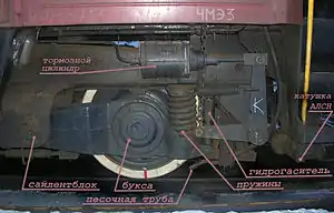 Тепловоз имеет две трёхосные тележки. Главная рама подвешена к каждой из тележек за четыре люлечных болта с амортизирующими резиновыми шайбами, люлечная подвеска за счёт веса тепловоза обеспечивает его удержание над тележками и возвращение при относе, но из-за того, что вес машины воспринимается резьбой болтов, подвешивание в процессе эксплуатации становится неразборным; для выкатки тележки приходится перерезать болты. Каждая букса находится внутри балансира (рычага), одним концом балансир соединён через сайлентблок с кронштейном рамы тележки, на другой рама тележки опирается через пружины с гидравлическим гасителем. Тяговые двигатели — с опорно-осевой подвеской. Благодаря сайлентблокам и гидрогасителям у тепловоза мягкий ход, но при несвоевременном обслуживании амортизаторы теряют масло, начинается сильная раскачка машины при движении. Также случаются разрывы изготовленных из сравнительно тонкой стали кожухов зубчатых передач, при этом от работы без смазки и перегрева заклинивают подшипники тяговых двигателей (моторно-якорные подшипники, МЯП).