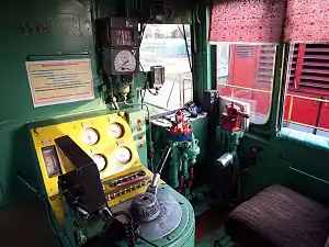 Пульт машиниста был смещён с разворотом к фронтальной плоскости кабины. В верхней части пульта располагалась панель, на которой отображалась информация о заданной и фактической позициях контроллера машиниста, остаточной ёмкости тяговых батарей и батареи собственных нужд, температуре воздуха в аккумуляторном отсеке и текущей скорости движения локомотива. Имелась световая индикация технического состояния батарей и их режимов работы. Локомотив был снабжен пультом дистанционного управления.