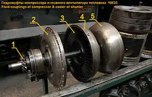 Наиболее мощные вспомогательные агрегаты тепловоза, главный вентилятор холодильника дизеля и воздушный компрессор, имеют привод от дизеля через отдельные отключаемые гидромуфты. Включаются гидромуфты при заполнении маслом из системы дизеля, при этом на холостых оборотах дизеля из-за низких давления масла и оборотов разгон компрессора затягивается, для его ускорения иногда приходится повышать обороты дизеля. Двухмашинный агрегат (объединяющий в себе вспомогательный генератор, вырабатывающий напряжение 110 В для цепей управления и освещения, и возбудитель) и два вентилятора охлаждения тяговых двигателей приводятся через клиноременные передачи, дополнительный вентилятор холодильника дизеля приводится электродвигателем, питающимся от вспомогательного генератора.