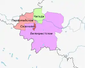Чагодощенский муниципальный район в рамках организации местного самоуправления включает 4 муниципальных образований нижнего уровня, в том числе 2 городских и 2 сельских поселения[27]: