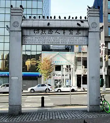На протяжении большей части истории в Чайна-тауне имелись уникальные архитектурные особенности, по которым обыватель сразу мог бы узнать этот нейборхуд. В 1962 году на Чатем-сквере была установлена мемориальная арка в честь лейтенанта Бенджамина Ральфа Кимлау — лётчика США китайского происхождения, погибшего во время Второй мировой войны в Новогвинейской кампании. Арка посвящена американцам китайского происхождения, погибшим во Второй мировой войне. Она выполнена по проекту местного архитектора по имени Пой Гам Ли[24]. Мемориал украшен каллиграфией авторства Юй Южэня. На площади также расположена статуя Линь Цзэсюя — фучжоуского чиновника, выступавшего против торговли опиумом в Китае. Её взгляд направлен вдоль Ист-Бродвея, где находится фучжоуский участок Чайна-тауна.