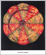 Третий центр (илл. III) — пупочная, или умбиликальная, чакра (IAST: Manipūra). Расположена над пупком (у солнечного сплетения). Имеет десять лепестков[17], окрашенных в различные оттенки красного и зелёного цвета. «Тесно связана» с чувствами и эмоциями человека.[K 12]