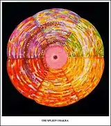 Второй центр (илл. II) — селезёночная чакра (в индийских книгах не упоминается). Расположена над селезёнкой. Предназначена для получения, разделения и распределения «жизненности», оккультной энергии, поступающей от солнца. Шесть её лепестков имеют цвет шести типов жизненной силы: красный, оранжевый, жёлтый, зелёный, голубой и фиолетовый.