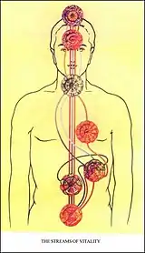 «Чакры, или силовые центры, — это точки соединения, через которые [оккультная] энергия перетекает из одной оболочки [или тела] человека в другую. Тот, кто, хотя бы в малой степени, обладает даром ясновидения, может легко увидеть их в эфирном двойнике в виде блюдцеобразных углублений или вихрей на его поверхности».[K 5][10][K 6]