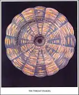 Пятый центр (илл. V) — глоточная, или гортанная, чакра (IAST: Viśuddha). Находится в области горла. У неё шестнадцать лепестков[17] попеременно голубого и зелёного цвета, с серебристым оттенком.