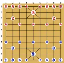 - В начальной расстановке генерал стоит на пересечении средней вертикали и второй от игрока горизонтали (в сянци генерал стоит на первой горизонтали).