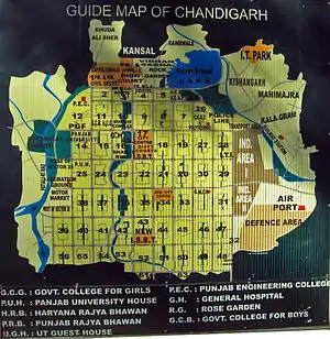 Ле Корбюзье сохранил общую идею плана, предложенного американцами, внеся в него, однако, много своего. Для города было предложено новое место — на равнине у подножия Гималаев, между двух рек, среди зелени эвкалиптовых и бамбуковых рощ. План города состоял из 47 секторов, размер каждого сектора — 800×1200 метров. Каждый из них представлял — теоретически — самостоятельное образование, с местом для проживания, работы и досуга. Это, по сути, самодостаточные городки, каждый со своими собственными школами, колледжами, храмами, рынком — все на расстоянии не более 10 минут ходьбы, в пределах границ сектора. Транспортные артерии дифференцированы по их назначению: система основных автомагистралей сочетается с подъездными дорогами более низкого уровня и живописными озеленёнными пешеходными дорожками внутри секторов. Комплекс административных зданий, Капитолий (сектор № 1), вынесен за пределы города и образует самостоятельный архитектурный ансамбль.