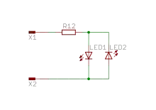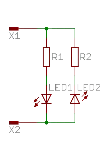 Разумеется, когда подан ток X1 → X2, ток будет проходить и по пути X1 → X3 → X2, поэтому надо позаботиться, чтобы падение напряжения на светодиодах было достаточно велико, чтобы половинное напряжение не зажгло лишних диодов.