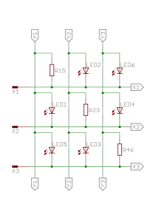 Как мы видим, сканирование чарлиплексированных диодов происходит таким образом: на один из выводов циклически подаётся «+», на остальные или «−», или ничего, в зависимости от того, зажжён диод или нет. Можно и наоборот, сканировать отрицательным напряжением, а в зависимости от того, горят ли диоды, подавать «+» или ничего: «−» на X1, «+» на X2, ничего на X3 (горит LED2), «−» на X2, «+» на X1, ничего на X3 (горит LED1), «−» на X3, «+» на X2, ничего на X1 (горит LED3).