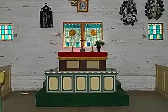 Интерьер часовни основан на крестьянских строительных традициях начала 19-ого столетия, которые искусно объединены с элементами стиля барокко. В 1837 году сельский столяр Йоханнес Клингберг (Johannes Klingberg) сделал кафедру, которая напоминает работы мастера Таллинского периода барокко Тобиаса Хейнтзе (Tobias Heintze, 1589—1635). На алтарном престоле и завесе стоит дата «1810», а на восьмигранной подставке для крестильной купели — «1802». Изображение Христа, висящее над алтарём, было подарено часовне мызником фон Таубе (C. von Taube) в 1831 году. На алтарной стене установлены витражные окна в оловянных рамах. Возле двери расположен короб для денег, куда можно положить пожертвования как изнутри здания, так и снаружи. На стенах висят венки из жести в память о погибших в море. У хорового места, по обе стороны алтаря находятся так называемые «немецкие» скамьи, где сидели представители зажиточных и уважаемых семейств[1][4].