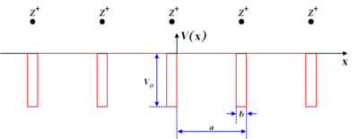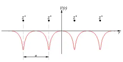 Рассмотрим одномерную решётку ионов, расстояние между которыми . Потенциал при этом будет периодическим. Рассмотрим сначала идеализированный случай бесконечного кристалла. Уравнение Шрёдингера имеет вид: