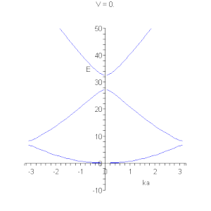 ![]() Линии отвечают разрешённым значениям энергии. Существуют области по энергии, где ни при каких значениях волнового вектора невозможно существование электрона. ![]() Линии отвечают разрешённым значениям энергии. Показано движение закона дисперсии в зависимости от глубины потенциальной ямы. На правом рисунке видно, как при некотором значении потенциальной энергии возможно образование одномерного бесщелевого полупроводника. |