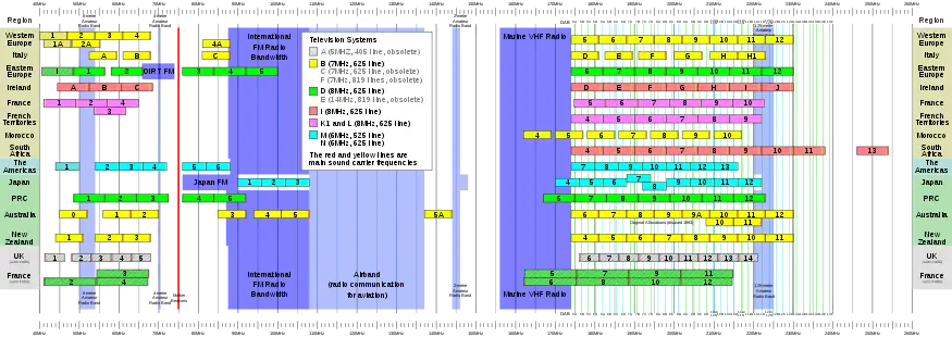 В нижеприведённых таблицах указаны частоты несущих изображения и звука для каналов телевещания в разных странах и регионах мира. Также указан тип используемой системы телевещания.