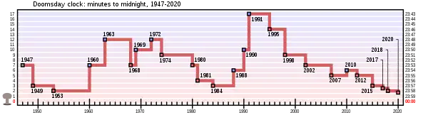 | 2020 | 1:40 | 23:58:20 | −0:20 | Неспособность мировых лидеров противостоять все более вероятным угрозам ядерной войны, таким как прекращение действия Договора о ликвидации ракет средней и меньшей дальности (ДРСМД) между США и Россией, усиление напряженности в отношениях между США и Ираном и отсутствие прогресса по вопросу разоружения КНДР. Продолжающаяся неспособность бороться с изменением климата. Усугубление глобальных проблем информационной войной в киберпространстве[7], рост числа фейковых новостей и спланированных кампаний по дезинформации в интернете[8]. На данный момент это самое близкое к полуночи положение стрелок Часов Судного дня за всю их историю. |